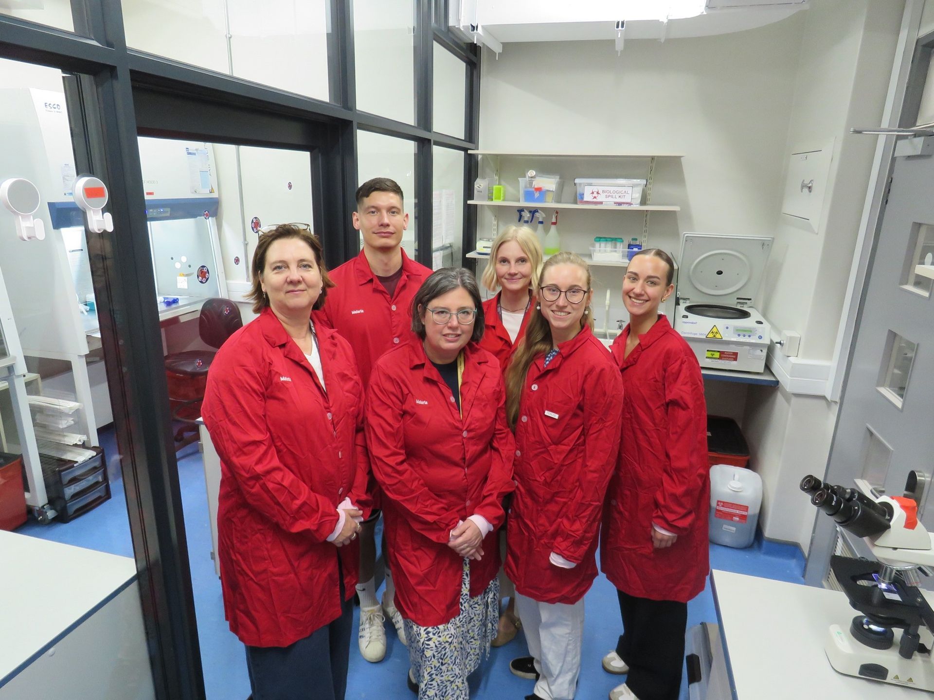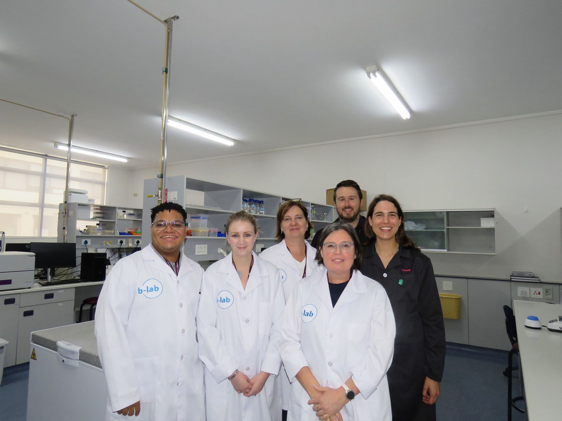 The project is conducted under the supervision of Lyn-Marié Birkholtz (Stellenbosch University, b-lab) in collaboration with Erick Strauss, as part of the Africa Centre for Therapeutics Innovation (ACTI), and is funded by the Gates Foundation. The project team is made up of (from left to right) PhD student Tyrick Welcome, researcher Tayla Rabie (University of Pretoria), L Birkholtz, researcher Katherine Clark, postdoc Konrad Mostert and postdoc Leandi van der Westhuizen.
